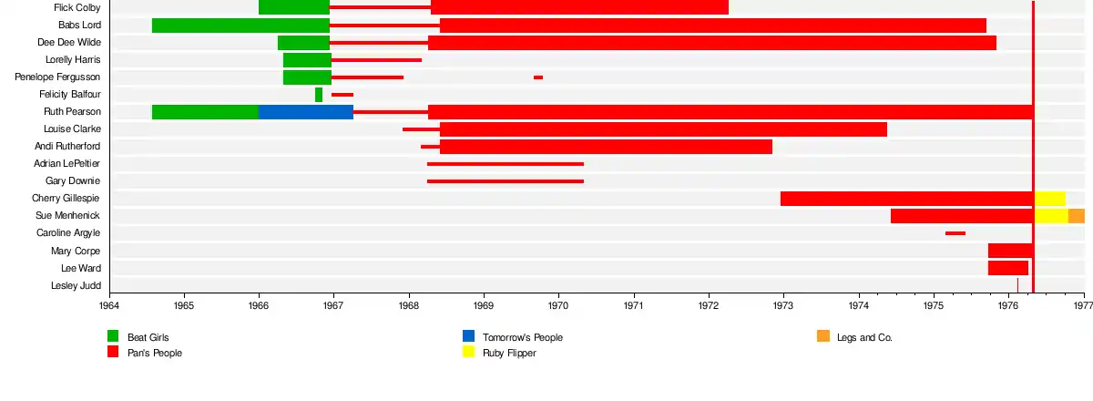 Pan's People succeeded the Go-Jos in May/June 1968 as the second dance troupe to make monthly appearances on Top of the Pops, when the series aired in black-and-white. They became a weekly feature of the programme following its revamp and time extension in January 1970 and continued for the next six years, giving their last performance in April 1976 when they were replaced by the short-lived Ruby Flipper, also choreographed by Colby.[2] As a result of line-up changes, only one dancer, Ruth Pearson, appeared on the whole run.