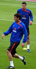 Van Nistelrooy made his debut for the Spanish club in a 1–0 friendly win over Reggina on 4 August 2006.[65] Van Nistelrooy scored a hat-trick in his second league match against Levante and, on 12 November 2006, he scored all four of Real Madrid's goals in a 4–1 victory over Osasuna. For the first six months he was a teammate of Ronaldo, a player whom Van Nistelrooy regards as the best he ever played with.[66][67] Van Nistelrooy won the league's Pichichi award with 25 goals as Real Madrid took home the 2006–07 title, and he also equalled the longest consecutive scoring streak in La Liga history with seven straight matches, tying a league record shared by Hugo Sánchez.[68]