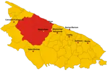 After the dominion of the Carafa, the liberal uprisings also touched Ruvo but failed miserably as in the rest of the South.[21] However, in the early nineteenth century Giovanni Jatta was particularly distinguished, who was elected by the ruvestines as the city's lawyer, won the case against the Carafa family, obtaining lavish compensation and was among the protagonists of those archaeological excavations that brought to light the numerous finds of Peucet, Greek and Roman period preserved in the Jatta museum.[22] In the period prior to the unification of Italy, Ruvo was the seat of a Carbonara sale called "Perfetta Fedeltà"[23] which included the patriot and lawyer Francesco Rubini who was responsible for organizing the Risorgimento uprisings also in Ruvo. In the post-unification period Ruvo, albeit slowly, knew the signs of progress also thanks to the ruvestine deputy and agronomist Antonio Jatta, who pointed out to the government the numerous problems of Apulia and the province of Bari. Fundamental milestones of progress were marked in 1905 from the arrival of electric lighting and in 1914 with the diffusion of public water. During the First World War 367 ruvestines fell on the battle fronts[24] while in the fascist twenty years other works of public benefit were carried out such as the reclamation of the quagmire and the creation of the sewer in 1938[25] of which still today we can distinguish some Fascist manhole covers with the Fascist coat of arms alongside the coat of arms of the municipality of Ruvo di Puglia. After the Second World War Ruvo distinguished itself in the cultural sphere, above all thanks to the works of the painter Domenico Cantatore, but also in the economic sphere with the flourishing vines and olive groves.