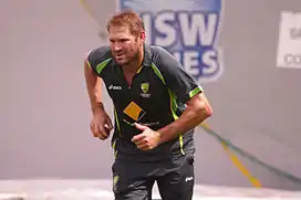 Ryan James Harris (born 11 October 1979) is an Australian cricket coach and former cricketer. He was a right-arm fast bowler who was a member of the Australia national cricket team until retiring in the Ashes tour lead up of 2015 due to a knee injury.[4] It had hampered him for a majority of his career, but despite this, he performed as one of Australia's most highly rated fast bowlers.[5]