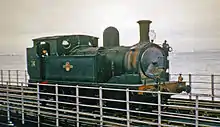 A second 'tramway' pier was built next to the first, opening on 29 August 1864.[3] Horse-drawn trams took passengers from the pier head to the esplanade. Before construction of the railway pier, the tramway continued to Ryde railway station at St John's Road. From 1886 to 1927, the trams were powered by electricity from a third rail, and from then until 1969 were petrol-powered.[4]