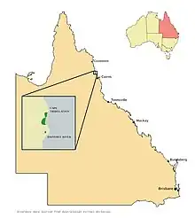 Ryparosa kurrangii grows as an understory tree in well developed rainforest.[5][8] It is endemic to Queensland, Australia, and restricted to an extremely small area, i.e. the coastal strip between the Daintree River in the south and Cape Tribulation in the north, and bounded by the Coral Sea to the east and the Great Dividing Range in the west.[9] The total area of occupancy of this species is just 64 km2 (25 sq mi).[10]