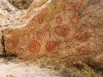 In a rock shelter in Sáchica, rock art in the form of pictographs has been discovered. The archaeologist Eliécer Silva Celis pioneered in the study of them in the 1960s. Later research has been performed by Carl Henrik Langebaek, Diego Martínez, Álvaro Botiva, Pedro Argüello García, and others. The black, red and white rock art is present at an altitude of 2,210 m (7,250 ft) at 5°35′29.058″N 73°31′15.926″W / 5.59140500°N 73.52109056°W and shows human faces, Suns, maize, eyes, mountains, masks, and other figures.[3] The rock art has been produced in rock shelters of Lower Cretaceous formations.[4]