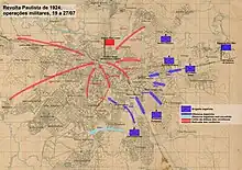General Isidoro proclaimed himself head of a "provisional government".[156][157] The state government was expelled from its headquarters, but this was not the original objective of the revolutionaries; if the Campos Elíseos Palace had been occupied without resistance, they would possibly have kept Carlos de Campos in power. General Isidoro declared in a manifesto that the revolution had no regional or personal objectives; the movement was solely against the federal government. Thus, mayor Firmiano de Morais Pinto was kept in office.[158] His responsibilities increased, filling the gap left by the state government.[159] This attitude contrasted with that of the municipal legislature: the councilors did not meet at any time during the conflict.[160]