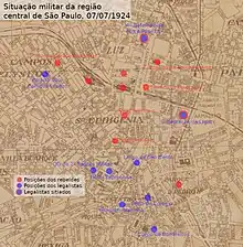 The loyalists came from Rio de Janeiro, via the Central do Brasil railway, and from Santos via the São Paulo Railway, conditioning their distribution in a semicircle extended from Ipiranga, to the south, to Vila Maria, to the east.[189] The front line then fell to the working-class neighborhoods on the periphery.[190] According to general Sócrates, the enemy defensive positions were strong. General Noronha had the opposite opinion, emphasizing the precariousness of the street barricades.[191] But several sources emphasize the defensive value of some points, notably factories.[lower-alpha 11]