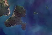 Satellite image of the Ilhabela archipelago. Major islands from left to right: Ilha de São Sebastião, Búzios island and Vitória island.