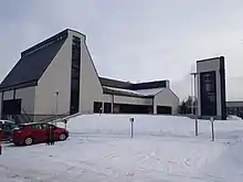 Söderkulla has comprehensive basic services. A few hundred meters apart are a health center, a dental clinic, Alko,[2] a pharmacy,[3] the Linda's service center for the elderly,[4] a gym,[5] R-kioski, a library, three grocery stores (such as K-Supermarket[6]), a kindergarten and the South Sipoo School. In connection with primary school, there is also a Swedish-language Söderkulla skolan. In 2018, Söderkulla Church, designed by Juhani Aalto, was completed in Söderkulla[7] and also as a parish center with study rooms, club rooms and a youth center. The church is used by both the Finnish and Swedish parishes in Sipoo.[8] The building utilizes geothermal and solar energy.[9]