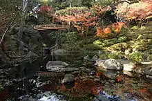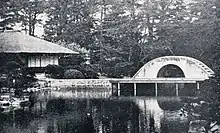 The tradition of sukiya onari (the shōgun visiting a daimyō's residence for a formal tea gathering) started during the rule of Tokugawa Hidetada, the second generation Tokugawa shōgun.[7] Furuta Oribe was Hidetada's tea master at this time and assumed a directorial role in the development of sukiya onari, a format of tea gathering especially for the warrior class, designed for entertaining the shōgun and daimyō. Following Oribe's ideas, Ueda Sōko designed the Wafūdō tea complex inside Hiroshima Castle to cater for the new sukiya onari format. After entering the castle gates for an official visit, the shōgun would first enter a roji (tea garden) and participate in chanoyu (a formal tea gathering) as the first part of the visit. The tea gathering would proceed from the sukiya (wabi-cha tearoom) to the kusari-no-ma (formal room with hanging kettle). Upon concluding chanoyu, the shōgun would cross to the shoin reception complex via a covered bridge where traditional entertainment from the time of the Ashikaga shogunate would take place.[11] The current home of the Ueda Sōko-ryū is a reconstruction of the Wafūdō built by Ueda Sōko on the grounds of Hiroshima Castle. As such, it provides a rare example of the warrior style of chanoyu developed by Furuta Oribe and Ueda Sōko.