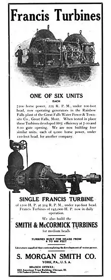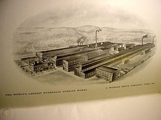Smith founded S. Morgan Smith in 1877 when it made its first sale of the turbine to a mill in Paradise Township, York County, Pennsylvania.[1] Smith used York Manufacturing and other machine shops to manufacture his products through the 1880s.[1] The Smith company was incorporated in 1886[2] and built its first factory in 1890, then employing 20 workers.[3] The company expanded to 166 employees by 1899 and was ranked as the 10th largest factory in the county.[1]