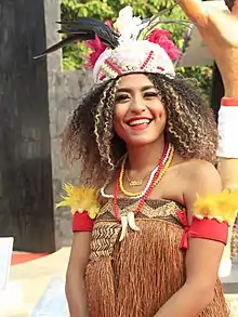 ![]() S. Olvah Alhamid as the Puteri Indonesia West Papua 2015 during the 2018 Asian Games torch ignition event with traditional clothing representing the island of Papua. | |