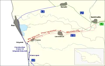 The Georgian S12 route (Georgian: საერთაშორისო მნიშვნელობის გზა ს12, Saertashoriso mnishvnelobis gza S12, road of international importance), also known as Samtredia-Lanchkhuti-Grigoleti, is a 56 kilometres (35 mi) long "road of international importance" within the Georgian road network which branches off the S1 highway in Samtredia and runs to the S2 highway near Grigoleti (Guria).[1] It is part of the main route between Kutaisi and Batumi, bypassing the Black Sea port Poti. Within the European E-road network it is referred to as E692. Most of the S12 is a two-lane road through villages and towns, while a limited part is a motorway since 2020. Upgrading the entire S12 to a four lane motorway is work in progress but experiences severe delays.