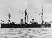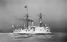 Following Diederichs's seizure of Jiaozhou Bay in November 1897, Deutschland, the protected cruiser Kaiserin Augusta, and the light cruisers Gefion and Cormoran reinforced the East Asia Cruiser Division. The arrival of the four ships allowed the division to be expanded to the East Asia Squadron.[17] Prince Heinrich, with his flag aboard Deutschland, departed Germany in December 1897 with Gefion; the two ships arrived in Hong Kong in March 1898. Prince Heinrich took the two ships on a tour of Asia, culminating in a state visit to Beijing in April.[18] While most of the Squadron went to the Philippines to safeguard German interests during the Spanish–American War in the summer of 1898, Deutschland, Gefion, and Irene remained in Chinese waters.[19] On 14 April 1899, Diederichs left the East Asia Squadron; command passed to Prince Henry and Deutschland became the Squadron flagship.[20]