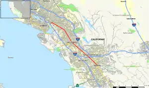 The 0.35-mile (0.56 km)[4] State Route 77 is part of a proposed 13.8 miles (22.2 km) route, which would run from I-880 northeast past SR 185 to Interstate 580 near High Street. There, it would turn northwest on I-580 toward Park Boulevard, splitting there to head northeast and north to State Route 24 near Lafayette.[5]
