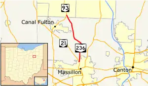 State Route 236 (SR 236, OH 236) is a two-lane north–south state highway in the northeastern portion of the U.S. state of Ohio. Its southern terminus is at a signalized intersection with State Route 21 in the northern end of Massillon. The northern terminus of the route is at a Y-intersection with State Route 93 in New Franklin. The route follows part of the Ohio & Erie Canal Towpath.