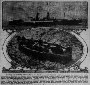 - ↑ "Thrilling Tales of Rescue Told by Survivors of Burning Greek Liner". The Bridgeport Evening Farmer. Bridgeport, CT. 24 September 1915. p. 9. Retrieved 24 September 2015 – via Chronicling America.