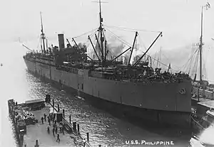 Philippines was converted into a troop transport at Hoboken, New Jersey by W. & A. Fletcher Co. between 28 April and 23 May 1919, at a cost of $226,815.[23] On 1 May, while still undergoing conversion, the ship was transferred to the United States Navy and commissioned as USS Philippines (ID-1677).[21] After conversion, USS Philippines had a crew complement of 25 officers and 168 enlisted men,[24] and a troop-carrying capacity of 86 officers and 3,940 enlisted men.[23]