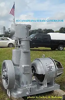 When restoration plans were not realized the remaining hull of the Canadiana was cut up for scrap in 2004 at Port Colbourne, Ontario.[7][23] The ship's engine was salvaged and returned to Buffalo to be part of a planned exhibit.[24] Much of the wooden superstructure, including the pilot house, was saved. Some of the salvaged wood was made into various memorabilia.