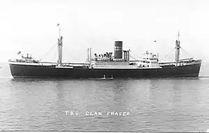 This was the third of four Clan Line ships called Clan Fraser. The first was a steamship built in 1878, sold in 1899 and wrecked in 1902.[3] The second was a steamship built in 1900, sold in 1919 and lost in 1920.[4] The fourth was a motor ship built in 1961, sold in 1965, burnt out in 1979 and scrapped in 1980.[5]