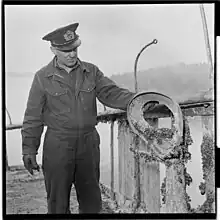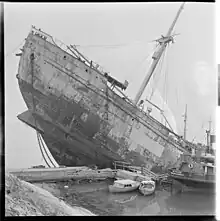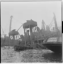 In January 1945 Donau shuttled between Aarhus in Denmark and Oslo in Norway.[2] On or shortly before 16 January, Roy Nielsen of Milorg and Max Manus of Kompani Linge planted ten limpet mines 0.5 metres (1.6 ft) below the waterline along a 60-metre (200 ft) section of the port side of Donau's hull, while she was docked in Oslo. The mines were meant to detonate in open sea once the ship had left Oslofjord, but her departure on the morning of 17 January 1945 was delayed, so they detonated before she reached Drøbak, where the captain managed to beach her.[10]