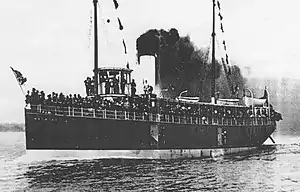In an effort to make Macassa more profitable, she was sent to the Collingwood Shipbuilding Company of Collingwood, Ontario, in 1905 to be lengthened.[15] Her hull became 178.4 feet (54.4 m) long, her gross tonnage 529 tons, her net tonnage 234 tons, and her carrying capacity 1,500 long tons (1,524 t); the reason behind the reduction of her tonnage after the lengthening is unknown.[4][5][7][16] The new piece was inserted between her pilothouse and funnel. Officers' quarters were constructed behind the pilothouse, the cabin on the promenade deck was enlarged, her mast was moved behind the pilothouse, and a second mast was installed aft.[5] The lengthening significantly decreased Macassa's length-to-beam ratio, causing her to roll badly even in moderate weather.[5] On September 19, 1906, a deckhand on board Macassa lost his foot after it became entangled in a mooring line while she was in Hamilton.[17]