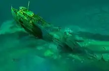 The wreck of Manasoo rests in 210 feet (64.0 m) of water, 0.5 miles (0.8 km) off Griffith Island.[27][34] The wreck is intact, although encrusted with zebra mussels, with its stern buried in the lake bottom and the bow pointing upwards at a 10° to 15° angle.[19][27][32] The pilothouse and helm are intact. Manasoo's collapsed funnel and two of her lifeboats are located on her deck, while another lies next to her wreck. Also within the wreck is Wallace's 1927 Chevrolet coupé, with its number plates still attached.[19][27][32]