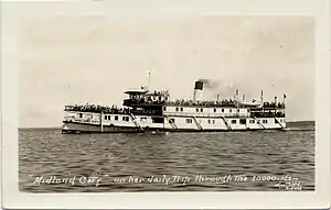 America was renamed SS Midland City in 1921, before a 1922 rebuild in Kingston that saw her weight increase to 580 tons gross.[2] Among the changes made during this refit was the installation of a bay to carry two cars. She was then brought to Georgian Bay where the steamer ran a regular route from Midland to Parry Sound, stopping in Honey Harbour, Minnicog, Whalen's, Go-Home-Bay, Wah-Wah-Taysee, Manitou, Copperhead, Sans Souci, and Rose Point.[8]