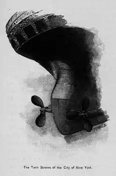 While size was increased by almost 25% to 10,500 GRT in the final design, the plan retained City of Rome's classic clipper bow and three raked funnels.[4] City of New York even had a figurehead of a female figure carved by sculptor James Allan.[5] To address the vibration problems of most liners of the period, the new Inman liners were given a ratio of length to beam of 8.3 to 1 as compared to the then common ratio of 10 to 1. The hull was more extensively subdivided than previously attempted. The ships were equipped with a full double bottom and 15 transverse bulkheads that reached the saloon deck. They also received a fore-aft bulkhead over their entire length.[4] Each ship had two triple expansion engines, of 9,000 indicated horsepower each that were placed in separate compartments. While the engines for the sisters were identical, City of Paris produced 1,500 more horsepower than City of New York.[5]
