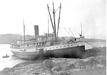 The dimensions of the ship were 197 feet (60 m) in length, 37-foot (11 m) beam, and 15-foot (4.6 m) depth of hold, 1,290 gross register tons (GRT). The power plant was a triple expansion steam engine, manufactured by Bow, McLachlan & Co. of Paisley, Scotland, producing 1,392 horsepower (1,038 kW).[3] The engine had three cylinders, with diameters ranging from high pressure to low pressure of 18, 30 and 50 inches (1,300 mm), with a bore stroke on all three cylinders of 36 inches (910 mm). The ship had design speed of 13 knots (24 km/h; 15 mph) and was driven by a single propeller.[1][2] The ship was built of wood. Princess Beatrice was one of the largest vessels to have been constructed in British Columbia up to that time.[2] The cost of construction was $200,000.[4]