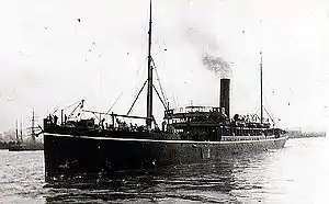 She was torpedoed in the starboard bow by a German submarine, while in convoy in the Mediterranean during the First World War. Her passengers and most of the crew were transferred to a warship, but senior officers and some crew remained on board. To prevent one of her forward bulkheads from collapsing, she sailed backwards for over 60 miles at a speed of 3.5 knots, eventually arriving in Oran, where temporary repairs were made.[2] Permanent repairs were then made in Gibraltar.