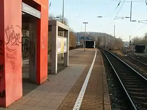 The station has been classified as a Haltepunkte (roughly “halt”) since 1960. The entrance building is about four metres high and nine metres wide. It has an entrance to tracks 1 and 2, but the entrance to platform 3 and 4 is closed.