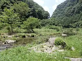 Another physical remnant of Chōgen's time along this river is the Notani Stone Bath (野谷石風呂, Notani ishiburo), located about 1.8 kilometers north of the Sabagawa Sekimizu in the Tokuji neighborhood of the city of Yamaguchi, Yamaguchi Prefecture. An ishiburo is a steam bath in which water is poured over heated stones to create a sauna. Chōgen constructed a number of these facilities in order to treat sicknesses and injuries of people engaged in work such as logging and transporting lumber. The Notani facility is the one of many which were once located along the Saba River at the time, and is situated on the south bank of the Shikotani River, a tributary of the Saba River. It consists of a cliff in which a rectangular area 0.9 meters high and 0.6 meter wide and two meters deep has been carved out. It was designated a National Historic Site of Japan in 1935.[3]
