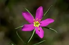 It is an annual plant growing to about 12 cm tall. The leaves are produced in opposite pairs, lanceolate, 5–15 mm long and 2–3 mm broad. The flowers are about 3.5 cm diameter, with a five-lobed corolla, purplish-pink with a pale yellow center, and five yellow stamens. The fruit is a capsule about 1 cm long.[2]