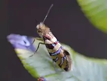 Sabatinca aurella is a species of moth of the family Micropterigidae.[1] It is endemic to New Zealand. The larvae of this species is variable in appearance but tends to be coloured yellow-green with greyish patches. The adults of the species have a pale golden appearance with silver or purple coloured bars on the forewings. The moth has an approximate wingspan of around 1cm. This species is found from the Coromandel Peninsula to the Fox Glacier and is on the wing from September to January. A larval host species is the liverwort Heteroscyphus lingulatus. The preferred habitat of this species is at higher altitudes than other New Zealand endemic species in this genus and it tends to prefer forest or sub alpine grass or scrubland.