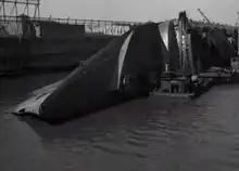 Driving along the New York waterfront, Kane's car passes by the capsized hulk of the liner SS Normandie, an ominous warning of what could happen if the conspirators succeed in their plans.[20]