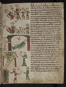 The Sachsenspiegel (German: [ˈzaksn̩ˌʃpiːɡl̩] ⓘ; Middle Low German: Sassen Speyghel; modern Low German: Sassenspegel; all literally "Saxon Mirror") is one of the most important law books and custumals compiled during the Holy Roman Empire. Originating between 1220 and 1235 as a record of existing local traditional customary laws and rulings, it was used in places until as late as 1900. Some legal principles as captured in the book reign into recent time laws throughout Europe. It is important not only for its lasting effect on later German and Dutch law but also as an early example of written prose in a German language.[1] The Sachsenspiegel is the first comprehensive law book not in Latin, but in Middle Low German. A Latin edition is known to have existed, but only fragmented chapters remain.