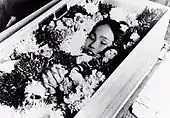 Sadako Sasaki in her casket, her body almost completely covered by flowers.