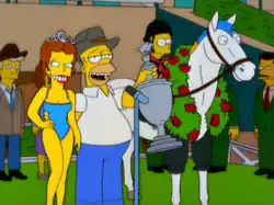 Duncan wins the Derby, sending the jockeys into a rage, and they begin chasing after Homer and Bart with swords. However, Marge and Lisa spray the jockeys with water to subdue them, and Homer stuffs them all into a garbage bag and leaves them at the curb to be hauled away with the garbage. Homer and Bart prepare to retire Duncan from racing, so he can become a stud. President Clinton then shows up at the Simpsons' house and presents Lisa with a plaque, overruling the state fair judges and declaring Springfield Elementary the winner of the music competition.