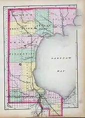 Saginaw Bay is a bay within Lake Huron located on the eastern side of the U.S. state of Michigan. It forms the space between Michigan's Thumb region and the rest of the Lower Peninsula of Michigan. Saginaw Bay is 1,143 square miles (2,960 km2) in area.[2] It is located in parts of five Michigan counties: Arenac, Bay, Huron, Iosco, and Tuscola.