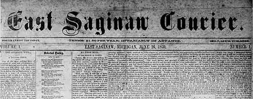 The history starts with The East Saginaw Courier that was first published in June 1859 by George F. Lewis.[1] It was printed in East Saginaw, Michigan, a city that no longer exists. The city was on the Saginaw River, located near the "thumb" region of Michigan. Lewis was the proprietor and first editor of the newspaper. It was at the beginning a four-page weekly publication. It came out on Thursdays. Lewis in 1861 sold his press equipment to Perry Joslin, proprietor of Saginaw Weekly Enterprise newspaper. The sale agreement was made so that Lewis could still use the press upon request. The East Saginaw Courier in 1863 updated and bought new printers. It was financed by Captain Lyon who then became a partner in the newspaper firm. Their central offices had moved around the city at least six times between 1859 and 1866.[2]