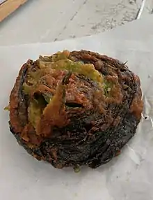 For the more complex preparation method (roll up) dasheen leaves and dough are layered by spreading dough onto the upper side of the current leaf. The stacked leaves are rolled up like roulades, fixated, and then either steamed[6] or cooked in a waterproof bag.[3] The rolls are then cut into slices, which are turned in spiced flour and dough and finally baked through. The dough for frying needs to be more chewy than the dough mixed with the leaves.[7] The roll-up method is mostly used for formal celebrations outdoors.