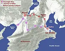 The procession of the saiō from Kyoto to Saikū, the saiō's official residence in Ise, was the largest procession of its kind in Japan for its time. Up to 500 people would set out from Kyoto as a part of the saiō's retinue for the journey, which lasted six days and five nights. From Kyoto, they travelled in an eastward direction, passing through the Suzuka Pass, which was without doubt the most difficult part of the journey. Once clearing the pass, the retinue would descend into the Ise region and turn south, eventually reaching the Kushida River (櫛田川). Here, the saiō would stop to perform a final cleansing ritual before crossing the river and travelling the short distance to Saikū.[10]