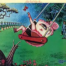With his design for a "sailing shoe" of a cake swinging on a tree swing, the album's front cover by Neon Park seems to be an allusion to The Swing by painter Jean-Honoré Fragonard.[5] Park himself said of the cover: "The Sailin' Shoes cover was inspired by Louis XIV. I'd just seen Rossellini's film about Louis XIV. And it seemed to relate a lot to Hollywood. A situation ruled by someone who kept everybody under his thumb by keeping them in hock from buying fancy clothes seemed to relate to Hollywood somehow. Actually, the only thing that was missing was the Hollywood sign, which I was going to put in the background. I thought that would be gauche. But I had a chance to pick up on that later with The Last Record Album.”[6][5] The cover design also includes a giant snail and Mick Jagger dressed as Gainsborough's The Blue Boy[5] as Park had been inspired by the film Performance.[6]