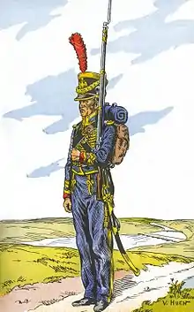 The uniform consisted of a blue tunic and Hungarian-style trousers. The tunic had red cuffs, decorations in the dolman style and scale epaulettes. The shako was black with a scarlet plume and an eagle helmet plate, and the shoes, waistbelt and cross-belt were also black. The waistbelt was in the light cavalry style.