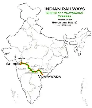 17208 / 08 Sainagar Shirdi–Vijayawada Express is a Express train belonging to Indian Railways Southern Railway zone that run between Sainagar Shirdi and Vijayawada Junction in India.[1]