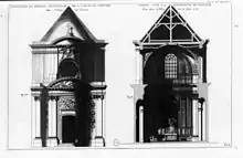 The new church was designed by Thomas Germain, known best for his work as a silversmith, and consisted of just a nave and an apse. The entrance of the church was in a circular projection decorated with Ionic pilasters. The apse housed the choir stalls of the canons surrounding the high altar. The nave was decorated with Corinthian pilasters surmounted by an entablature. In the chapel of the Virgin there was a sculpture of the Annunciation by Jean-Baptiste II Lemoyne. The church was also decorated with works by members of the families of painters, Coypel, Restout, and Van Loo. The building enjoyed a good reputation in the middle of the 18th century for its singular plan and rich internal decoration. However, the style of the exterior and portico came under some criticism.[2]