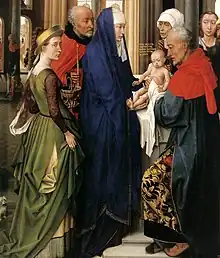The presentation takes place in the octagonal building's entrance, in an area surrounded by monumental arches, another bold and innovative use of space and perspective.[4] The walls on the far right of the Adoration panel show the exterior of presentation's building, creating a jarring spatial and temporal juxtaposition: the stable is in Bethlehem, the Temple in Jerusalem, yet across the panels they co-exist, perhaps as a bridge between the Old and New Testaments. The innovation allows the narrative to flow in a continuous fashion across the altarpiece,[2] a device also used in his c. 1452 Braque Triptych.[11]