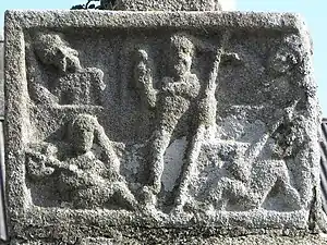 The calvary here is the work of the Roland Doré workshop and was started in 1610. The pietà is regarded as one of Doré's best works. Amongst the statuary is a depiction of Saint Servais with key as well as Saints Peter and Paul. On the reverse side of the depiction of Jesus on the cross there is "Christ aux liens" capturing that poignant moment when Jesus sits awaiting crucifixion. John the Evangelist and the Virgin Mary are on the reverse side of Peter and Paul as Doré uses the Breton tradition of statues "géminées". The cross stands on a square base which carries four bas-reliefs dating to 1548. These depict the flagellation, the crowning with a crown of thorns, Jesus carrying the cross and the Resurrection.[4]