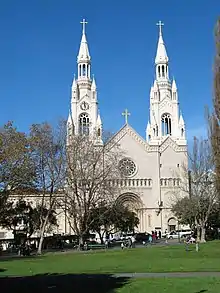 Saints Peter and Paul Church (Italian: Ss. Pietro e Paolo, Chinese: 圣伯多禄圣保禄教堂; pinyin: Guānhuà Shèngbǎoluó Shèngbǐde Jiàotáng) is a Catholic church in San Francisco's North Beach neighborhood. Located at 666 Filbert Street, it is directly across from Washington Square and is administered by the Salesians of Don Bosco. It is known as "la cattedrale italiana dell'Ovest", or the Italian Cathedral of the West (the use of the word "Cathedral" is merely colloquial, not an official designation), and has served as the home church and cultural center for San Francisco's Italian-American community since its consecration. It offers English, Italian, and Cantonese-language services.
