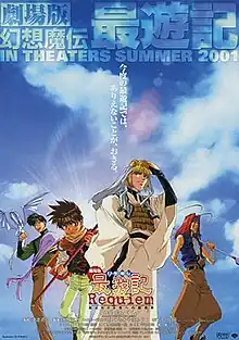 Saiyuki: Requiem or Gensomaden Saiyuki: Requiem - For the One Not Chosen (劇場版 幻想魔伝最遊記 Requiem 選ばれざる者への鎮魂歌, Gekijouban Gensou Maden Saiyuuki: Requiem - Erabarezaru Mono e no Chinkonka) is the first animated film adaptation of the anime and manga series Saiyuki produced by Pierrot.[2][3] The events of the film take place after the first series, on the way west, the priest Genjo Sanzo and his three demonic companions, Son Goku, Sha Gojyo and Cho Hakkai, save a girl who is being chased by a giant bird. Out of gratitude, she invites them to her house and provides them with food and shelter. Once there, strange things began to happen.