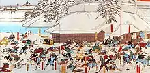 The assassination took place on March 24, 1860, on the day of the Double Third Festival where all daimyos stationed in Edo (modern Tokyo) were scheduled to enter Edo Castle for meetings. The assassins attacked Ii's entourage just outside the Castle, near the Sakuradamon (Sakurada Gate) when Ii was reaching the premises.[1] Ii had been warned about his safety, and many encouraged him to retire from office, but he refused, replying that "My own safety is nothing when I see the danger threatening the future of the country".[5]